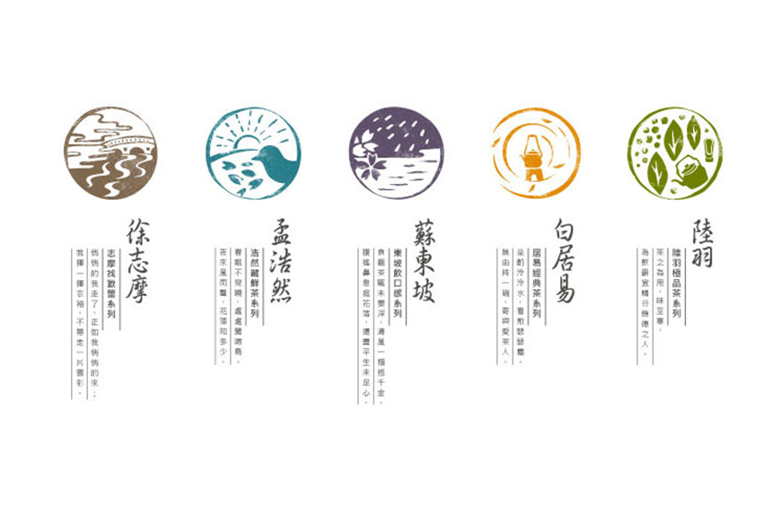 輔助圖形結合產品種類,透過與5位詩人的詩句結合,讓畫面呈現出不同飲品所要帶給消費者不同的體驗。