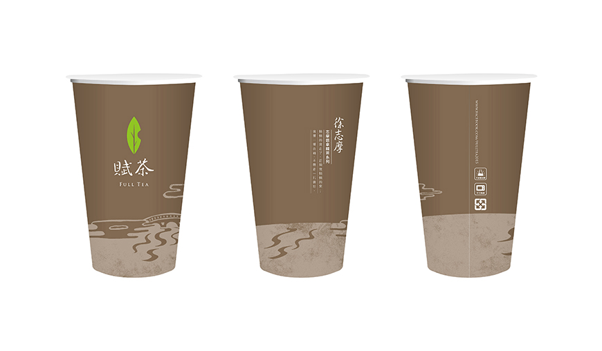 跳脫市場大多手搖飲品以塑膠杯的方式呈現飲料,賦茶選用雙層式的紙杯設計,視覺上以輔助圖形的設計及詩句的結合,讓茶中有詩;詩中有茶,傳遞出古人飲茶的悠然,淨白的設計傳遞出飲品的純粹。